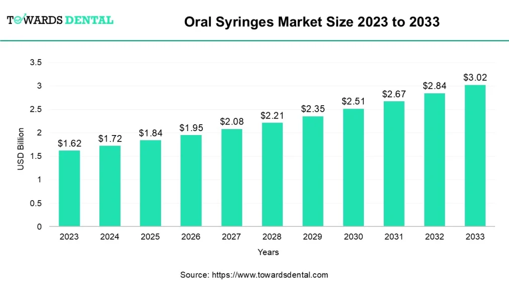 According to Precedence Research’s Report, the global oral syringes market was USD 1.62 billion in 2023 and is estimated to reach around USD 3.02 billion by 2033, expanding at a CAGR of 6.43% from 2024 to 2033.