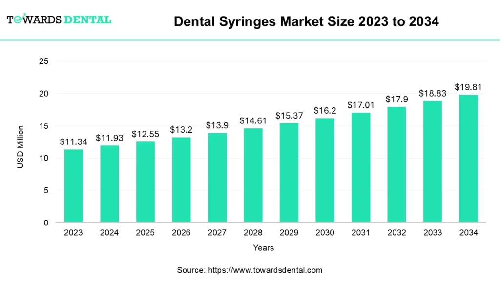 According to Precedence Research’s Report, the global dental syringes market size was USD 11.34 million in 2023 and is predicted to grow around USD 19.81 million by 2034, with a remarkable growth to USD 11.93 million in 2024 expanding at a CAGR of 5.2% from 2024 to 2034.