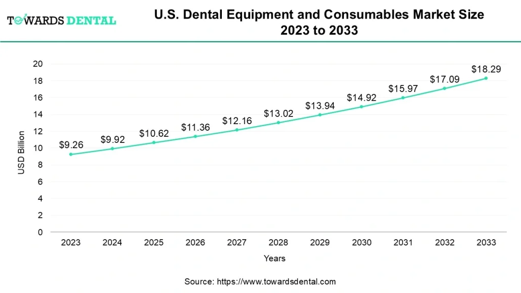 According to Precedence Research’s Report, the global dental equipment and consumables market size was USD 32.28 billion in 2023 and is predicted to grow around USD 63.74 billion by 2033, with a remarkable growth to USD 34.56 billion in 2024 expanding at a CAGR of 7.04% from 2024 to 2033.