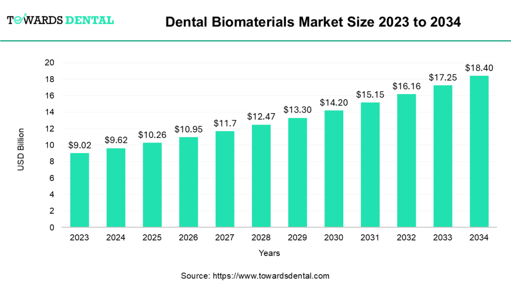 As per Precedence Research’s findings, the global dental biomaterials market size accounted for USD 9.62 billion in 2024 and is expected to reach around USD 18.4 billion by 2034, expanding at a CAGR of 6.7% from 2024 to 2034.