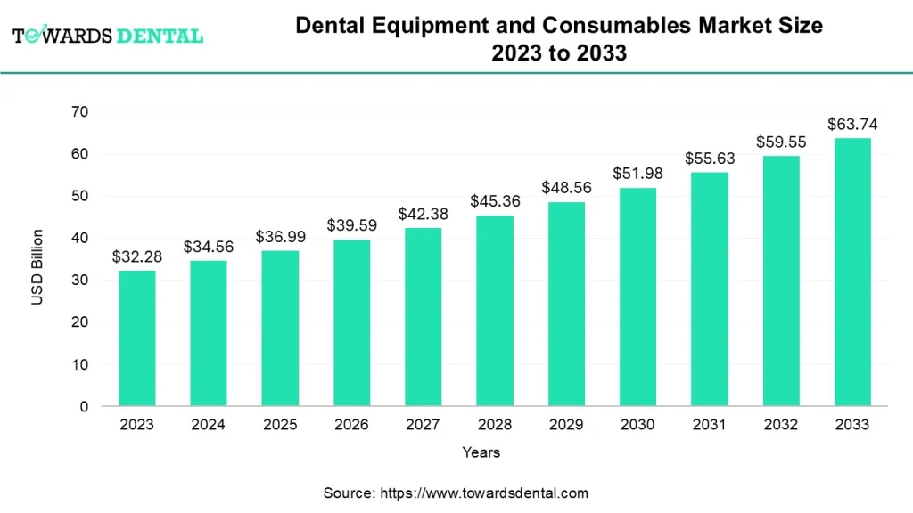 The global dental equipment and consumables market size surpassed USD 32.28 billion in 2023 and is estimated to hit around USD 63.74 billion by 2033, growing at a CAGR of 7.04% from 2024 to 2033.