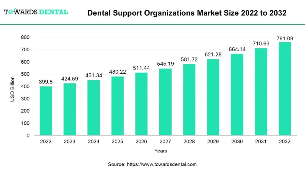 Insights from Precedence Research report reveals that the global dental support organizations market size was USD 399.8 billion in 2022 and is estimated to be valued at USD 761.09 billion by 2032, expanding at a CAGR of 6.7% during the forecast period 2023 to 2032.