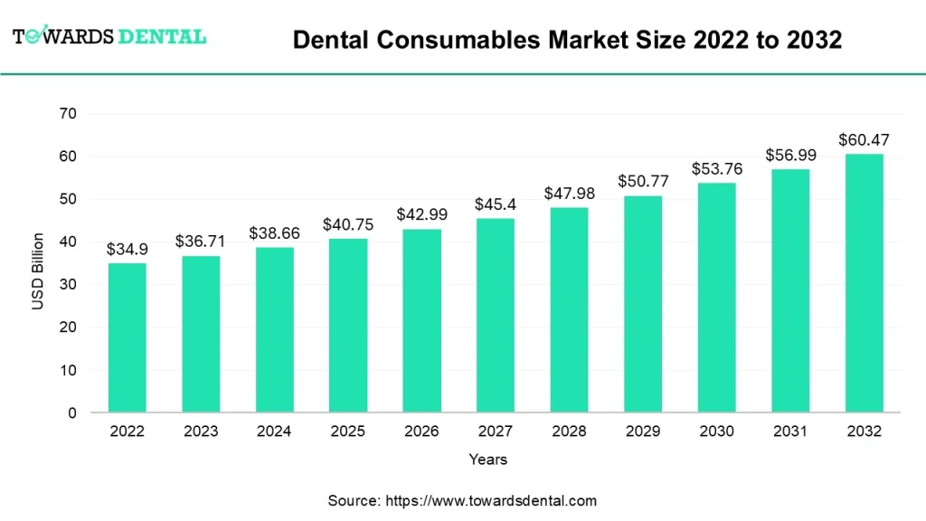 According to Precedence Research’s Report, the global dental consumables market size was USD 36.71 billion in 2023 and is predicted to grow around USD 60.47 billion by 2033, with a remarkable growth to USD 38.66 billion in 2024 expanding at a CAGR of 5.70% from 2023 to 2032.