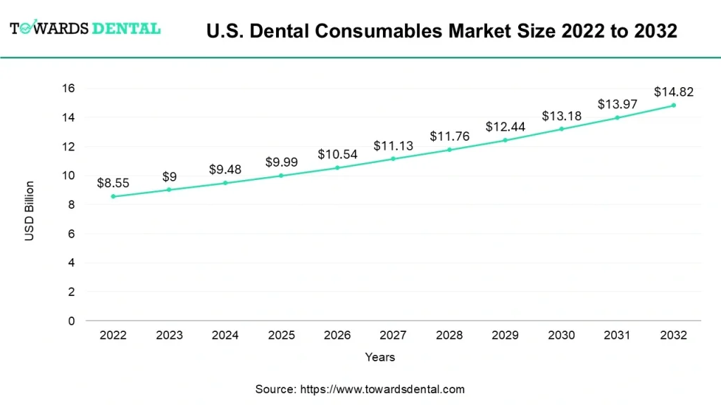 A recent report from Precedence Research Reveals that in the U.S., the dental consumables market size is calculated at USD 9 billion in 2023 and is expected to hit around USD 14.82 billion by 2032, with a remarkable growth to USD 9.48 billion in 2024 estimated to grow at a CAGR of 5.8% from 2023 to 2032.