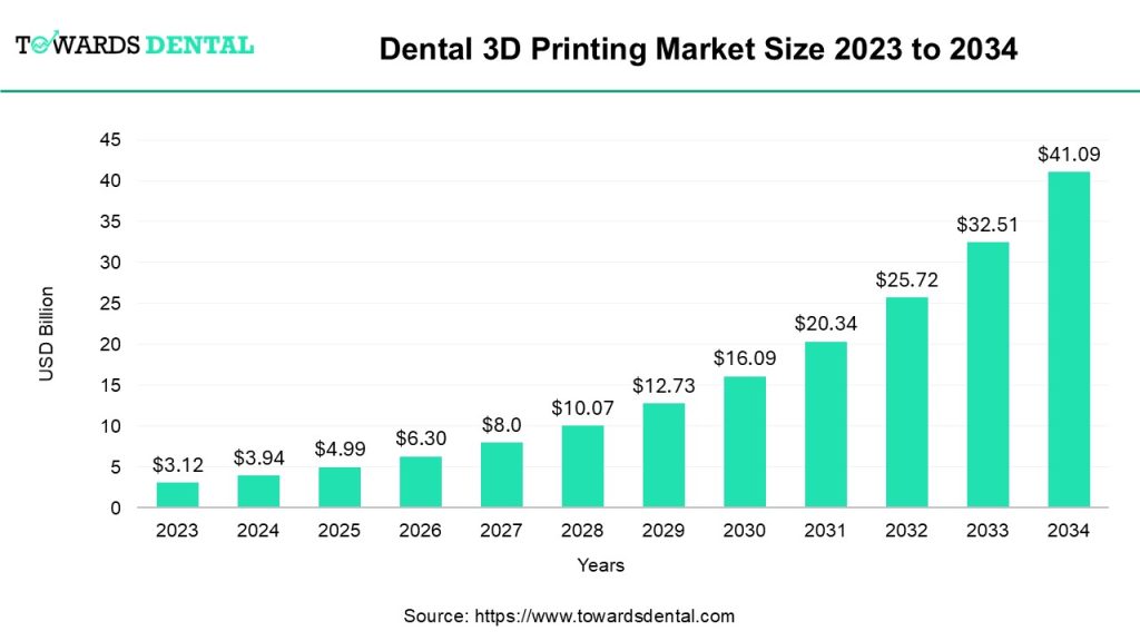 According to Precedence Research’s Report, the global dental 3D printing market was USD 3.12 billion in 2023, estimated at USD 3.94 billion in 2024, and is predicted to reach around USD 41.09 billion by 2034, expanding at a CAGR of 26.41% from 2024 to 2034.