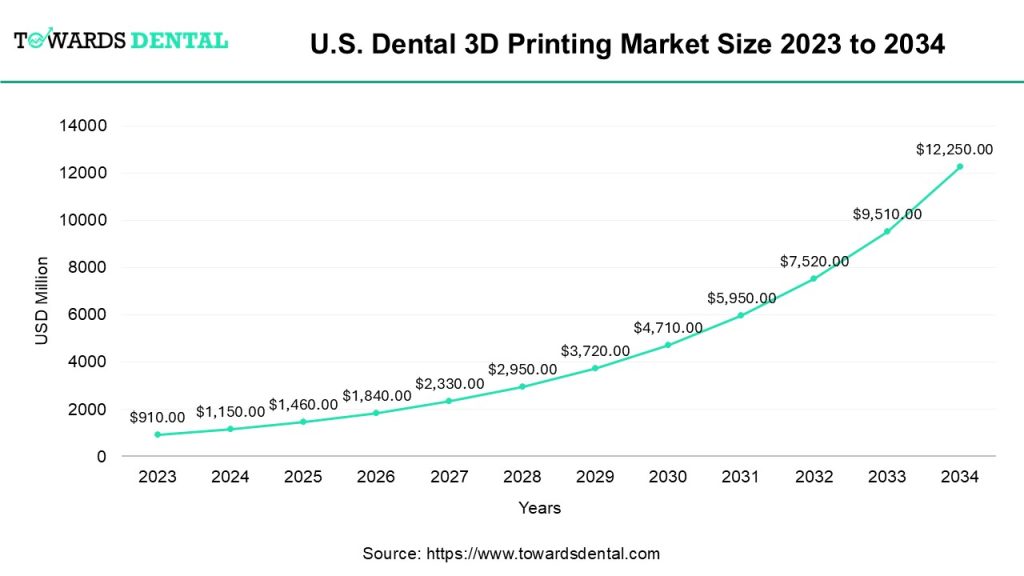 The U.S. dental 3D printing market size was USD 910 million in 2023 and is expected to hit around USD 12,250 million by 2034, registering a remarkable CAGR of 26.66% from 2024 to 2034.