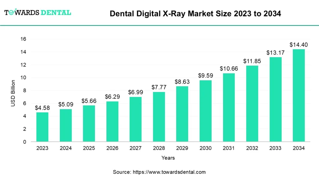 According to Precedence Research’s Report, the global dental digital X-ray market size was USD 4.58 billion in 2023 and is predicted to grow around USD 14.40 billion by 2034, with a remarkable growth to USD 5.09 billion in 2024 expanding at a CAGR of 11% from 2024 to 2034.