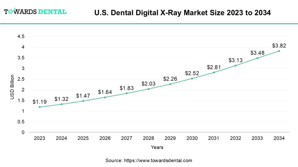 In the U.S., the dental digital X-ray market size is calculated at USD 1.19 billion in 2023 and is expected to hit around USD 3.82 billion by 2034, with a remarkable growth to USD 1.32 billion in 2024 estimated to grow at a CAGR of 11.19% from 2024 to 2034.