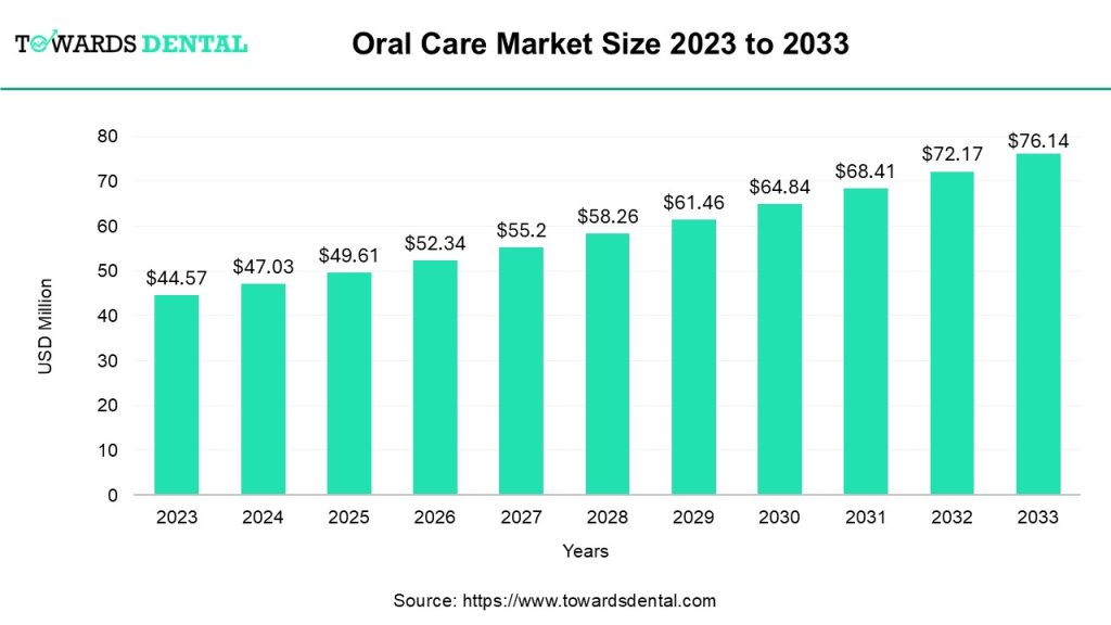 As per the detailed report of Precedence Research, the oral care market size accounted for USD 44.57 billion in 2023 and is predicted to be worth around USD 76.14 billion by 2033, growing at a solid CAGR of 5.5% from 2023 to 2033.