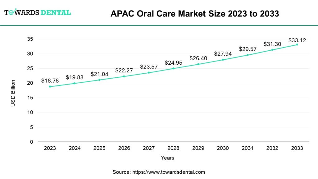 The Asia Pacific oral care market size was USD 18.78 billion in 2023 and is predicted to grow around USD 33.12 billion by 2033, with a remarkable growth to USD 19.88 billion in 2024 expanding to a CAGR of 5.8% from 2024 to 2033.
